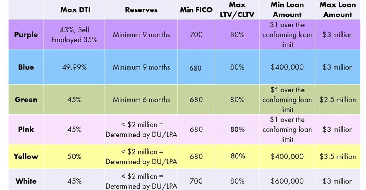 As rates continue to fluctuate we will review your specific scenario to determine the eligibility based on your credit score, down payment, reserves, and loan size. The chart below is a basic overview of the products offered and does not guarantee loan approval.